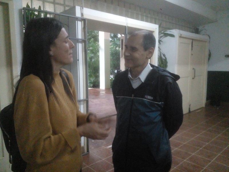 Soledad Balán saluda al padre Alberto Barros, que fue a votar en la Escuela Normal Mixta EEUU de Brasil. Balán votó en otro lugar pero estuvo recorriendo establecimientos y saludando a la gente. Avisó que cualquiera que necesite transporte se puede comunicara dos whatsapp que hay en sus redes, “solo los llevamos a votar como un servicio”, aclaró.