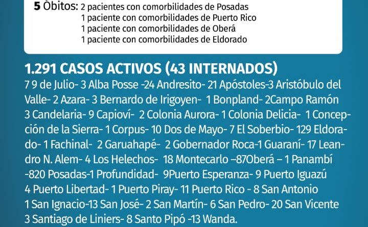 Las autoridades sanitarias de Misiones informaron esta tarde 147 casos nuevos de Covid-19, de los cuales 86 se registraron en Posadas. Además, se reportaron 5 fallecimientos. Dos de Posadas, y uno en Puerto Rico, Oberá y Eldorado. En el día de ayer se habían informado 135 nuevos contagios, por lo tanto, la cifra volvió a subir y hace ya varias semanas que no baja de los 100.