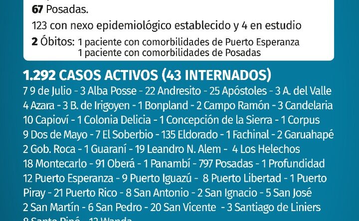 Además, se reportaron dos nuevos fallecimientos por Covid-19, uno en la capital misionera y el otro en Puerto Esperanza.
