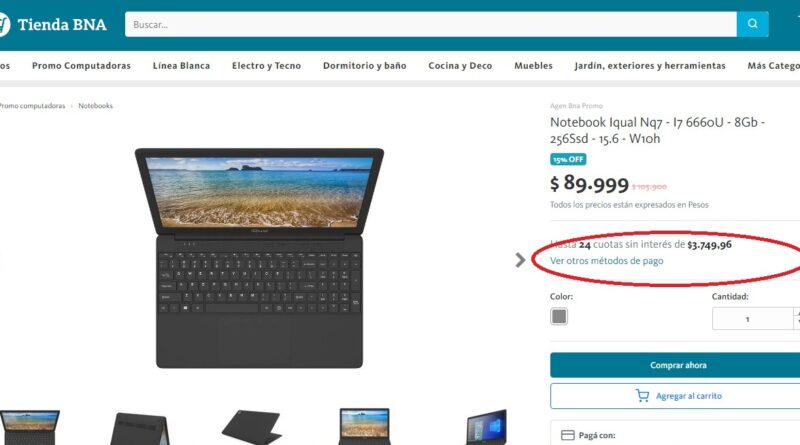 Algunas de las ofertas incluyen, por ejemplo, una notebook Iqual Nq7- I7 6660U – 8Gb – 256Ssd – 15.6 – W10h. El valor de esta notebook era de 105.900 pesos pero tiene un descuento por la promoción del 15%. El total, de 89.999 pesos se financia con 24 cuotas iguales, sin interés, de 3.750 pesos cada una.