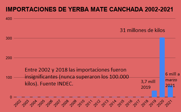 Entre 2002 y 2018 prácticamente no se importó yerba canchada. En el 2019 se importaron casi 4 millones de kilos, un récord. En 2020 las importaciones aumentaron 900 por ciento y batieron otro récord. Este año van camino a una nueva marca histórica si se mantiene el ritmo de importaciones de enero, febrero y marzo.