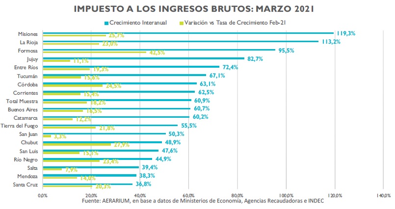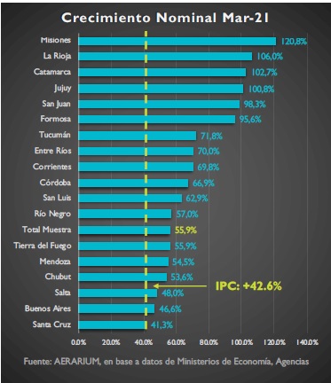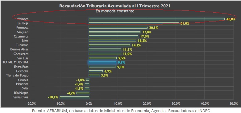 “Trece de las 18 jurisdicciones analizadas cerraron el trimestre con variaciones positivas en términos reales, destacándose las performances de Misiones (+46.8%) y La Rioja (+31%). En contraposición, se observa que las 5 jurisdicciones con crecimiento inferior a la inflación presentan economías muy dependientes de la actividad petrolera y el turismo, ambas actividades que todavía sufren los efectos de la pandemia”, explicó la consultora Aerarium, fundada por Paulino Caballero y Guillermo Giussi, dos economistas que trabajaron con Rogelio Frigerio en el Ministerio del Interior y, antes, en la consultora Economía & Regiones.