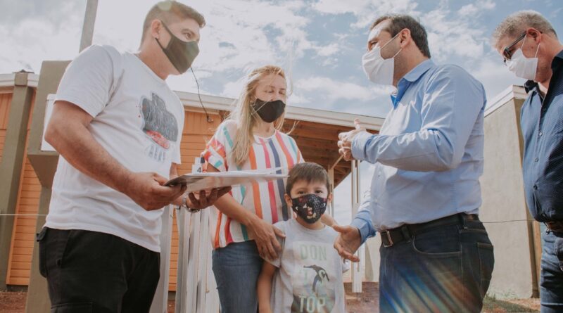 Sobre el mediodía, Herrera Ahuad, acompañado por el intendente Leonardo Stelatto y el titular del IPRODHA, Santiago Ros, entregaron 66 viviendas en Itaembé Guazú.