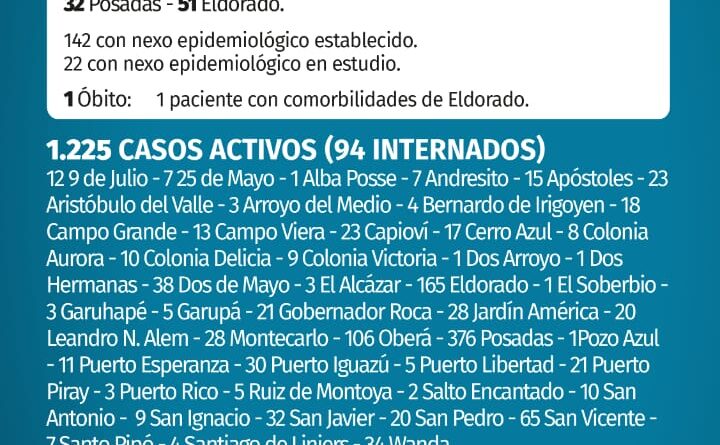 Además, el parte diario dio cuenta de un fallecido en Eldorado, con morbilidades (probablemente el parte refiera el caso del intendente de Wanda, Felipe Jeleñ, fallecido ayer en el Samic de esa localidad).