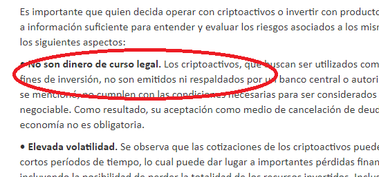 Riesgo de lavado de activos, financiación al terrorismo y potencial incumplimiento a la normativa cambiaria (Plan B: esta es una de las advertencias más importantes, porque el BCRA dice: cuidado porque pueden violar las normas cambiaras, que en el caso de la Argentina son muy fuertes por el cepo al dólar, y las normas de lavado de activos. ¿Por qué es de las más importantes? Porque es el BCRA el que, en el caso de la Argentina, define las normativas cambiarias y colabora en definir las normas que pueden infrigir reglas anti-lavado).