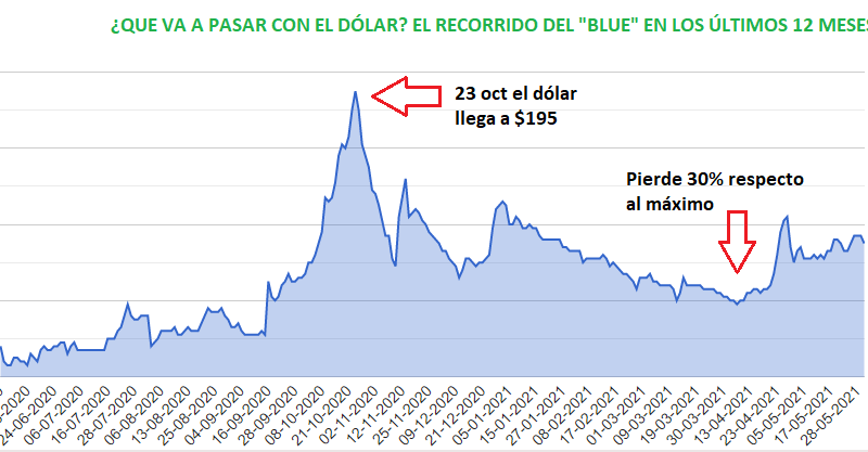 Con esa pequeña recuperación de abril, la caída del dólar respecto a su pico de casi 200 pesos fue de 20%.