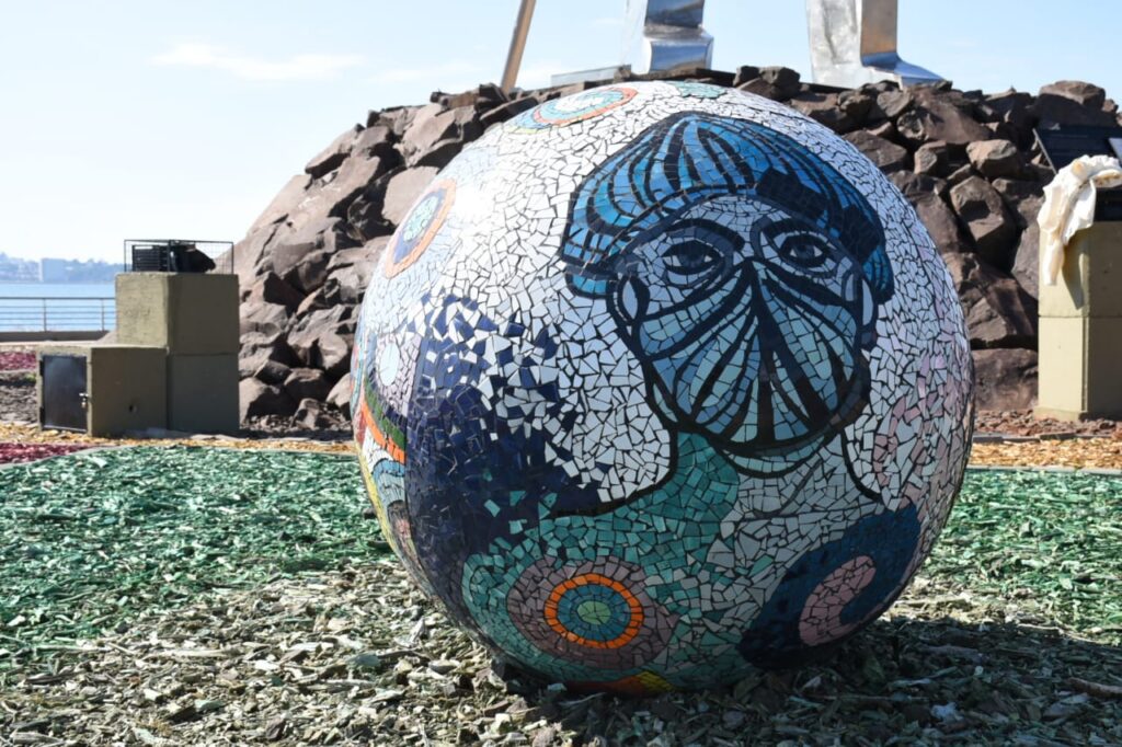 La obra conmemorativa es una esfera de mosaicos y representa el reconocimiento de los misioneros a los hombres y mujeres del sistema sanitario. El monumento fue creado por el equipo del área de Artes del Fuego del Parque del Conocimiento, forrado con esmaltes y pedacitos de cerámica o teselas colocados uno por uno a mano. El dibujo del rostro en la obra es del artista plástico Nadalino Rioja Huayra Nahuel, y el mosaico fue realizado por la ceramista Evelyn Ventosinos