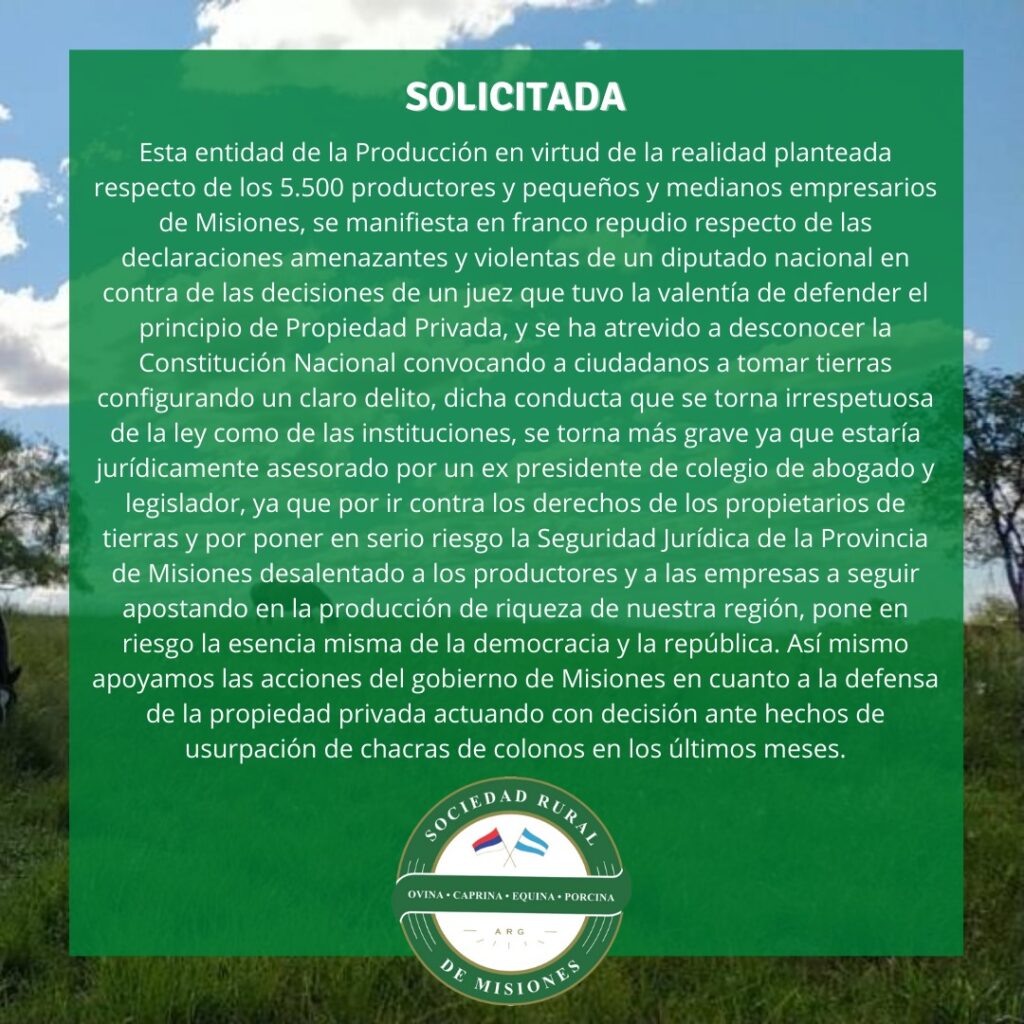 “Esta entidad se manifiesta en franco repudio respecto a las declaraciones amenazantes y violentas de un diputado nacional en contra de las decisiones de un juez que tuvo la valentía de defender el principio de propiedad privada”, señaló en una Solicitada la Sociedad Rural de Ganado Menor de Misiones.