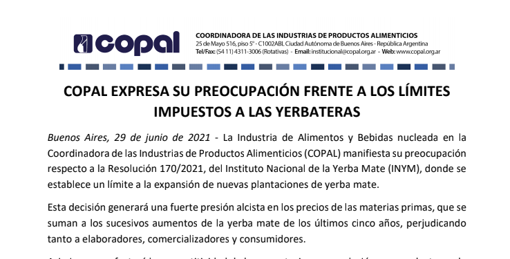 Con el título “Copal expresa su preocupación ante los límites impuestos a las yerbateras”, la cámara que tiene mucho peso en la Unión Industrial Argentina, “manifiesta su preocupación respecto a la Resolución 170/2021, del Instituto Nacional de la Yerba Mate (INYM), donde se establece un límite a la expansión de nuevas plantaciones de yerba mate”.