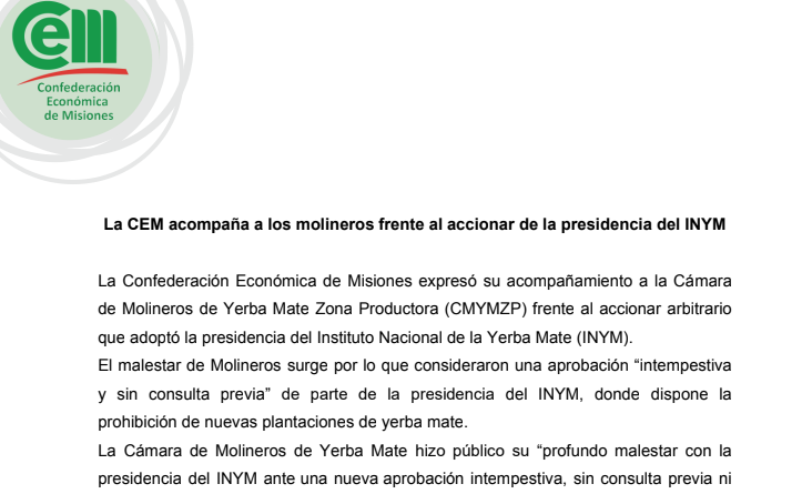 La entidad difundió un comunicado donde se expresa que “La CEM acompaña a los molineros frente al accionar de la presidencia del INYM”.