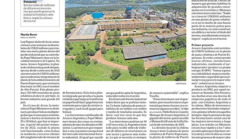 Luis Pagani, titular de Arcor, anunció hace unas semanas un desembolso de US$20 millones para instalar una nueva planta dentro del predio industrial que su controlada Papel Misionero tiene en la localidad misionera de Capioví. En tanto, Arauco Argentina, la planta de celulosa más grande del país, ejecuta desde comienzos de 2021 una inversión de US$150 millones para modernizar integralmente la planta de la localidad misionera de Puerto Esperanza, que comenzó a funcionar en 1982 con el nombre de Alto Paraná. Esta planta produce 350.000 toneladas de pasta celulósica al año y es -por lejos-, la foresto industria más grande del país.