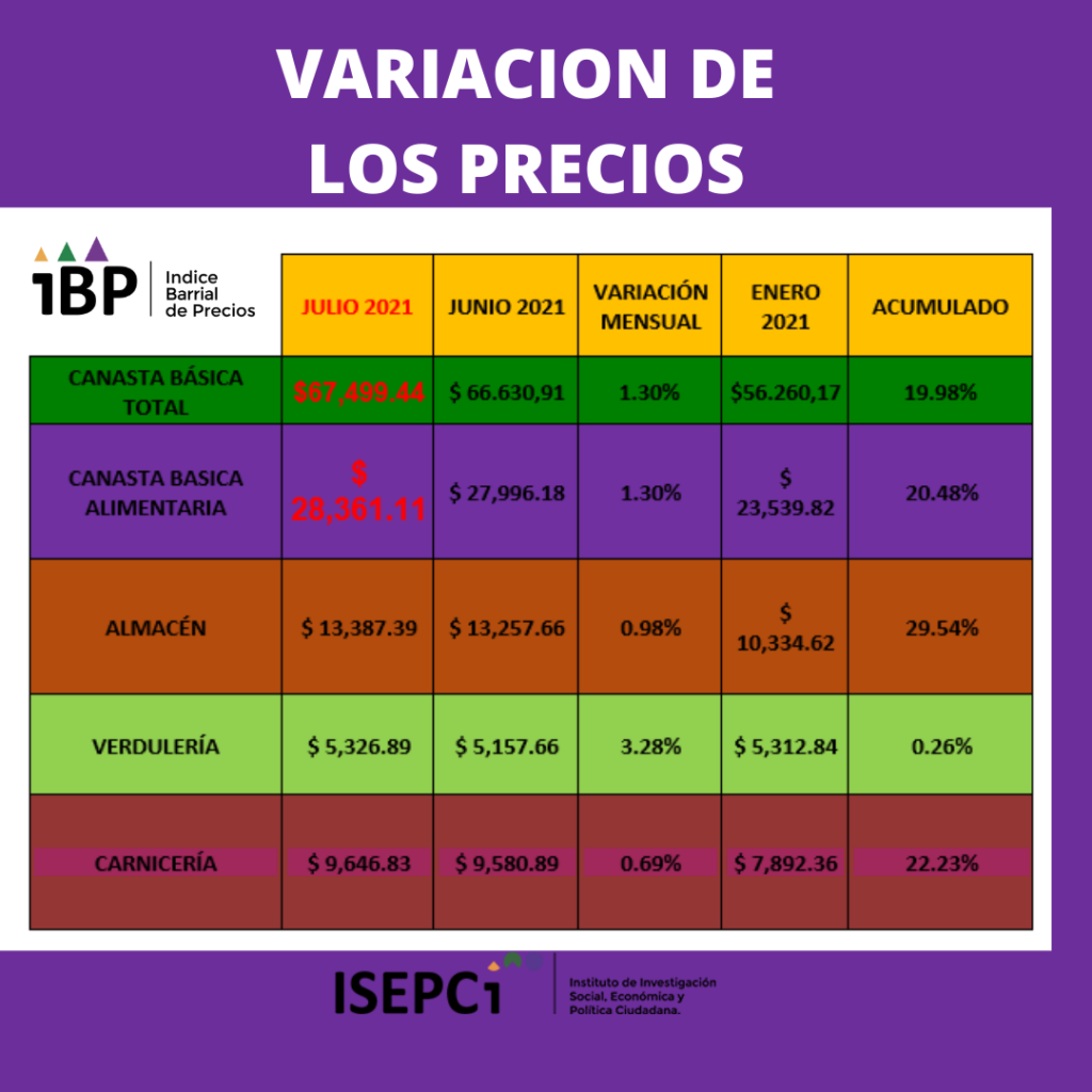 Según los precios de julio, la CBT para una familia de cuatro personas arrojó un monto de $67.499,44, con un incremento de 1,30% respecto a junio. En tanto, en lo que va del año la CBT relevada por el ISEPCI, arrojó un incremento de 19,98%.