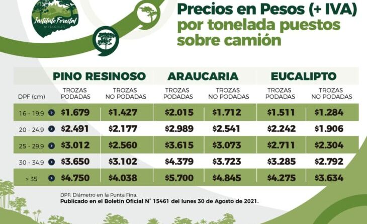 «Mediante el Acta de Directorio N° 09/21 y Resolución N° 06/21 se ratificó la facultad de actualizar los precios de producción de madera rolliza de las especies: Pinus sp, Araucaria y Eucalyptus con destino industrial para Aserrío y Laminable, conforme el índice que figura en la parte dispositiva, hasta el establecimiento de una nueva fijación de precios, dejándose sin efecto toda otra disposición en contrario», indicaron en la publicación