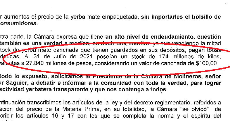 Ahora en un comunicado, los productores yerbateros afirmaron que el problema del endeudamiento de los industriales, que siempre esgrimen como un problema para pagar mejores precios, no es tan importante como lo pintan, ya que sus existencias de yerba mate canchada en depósitos tiene un valor de 27.840 millones de pesos o 174 millones de kilos de yerba canchada (a un valor de 160 pesos).