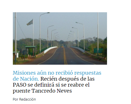 Desde la Secretaría de Comunicación del gobierno de Misiones señalaron que la apertura del “Tancredo Neves se hará “tal como lo había solicitado Misiones hace más de un mes: se autoriza la creación de un corredor turístico y sanitario seguro entre las ciudades de Puerto Iguazú y Foz de Iguazú, que se hará efectivo a partir del próximo lunes 27 de septiembre”, informó el diario Clarín.