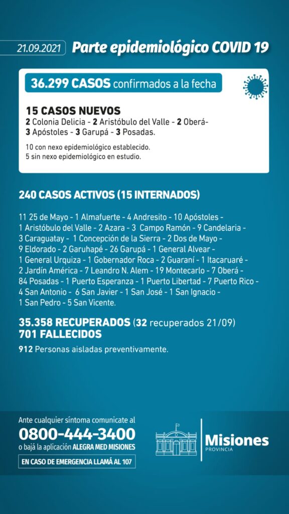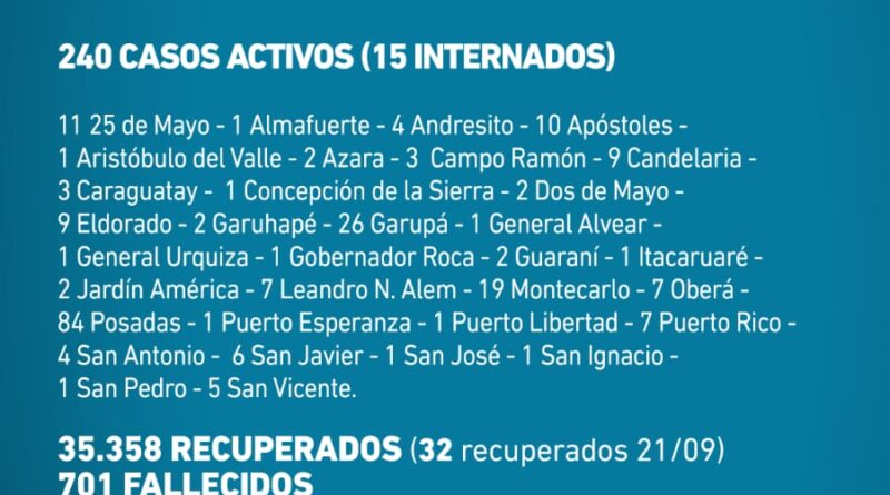 Misiones tiene al día de hoy 240 casos activos y apenas 15 de esos casos requieren internación. Hasta el día de hoy, la pandemia del Coronavirus reportó 701 fallecidos en la tierra colorada.