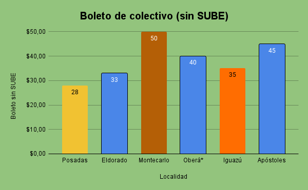 En Oberá se aumentó a 50 pesos, aunque al designarse a Carlitos Fernández candidato en las PASO por la Renovación, el gobierno provincial le mandó fondos para subsidiar parte de ese incremento, con lo cual el boleto sin tarjeta quedó en 40. En tanto en Eldorado el valor sin tarjeta se llevó a 33 pesos, en Iguazú a 35 y en Apóstoles a 45 pesos sin sube y 40 con SUBE (tienen la SUBE Nacional).