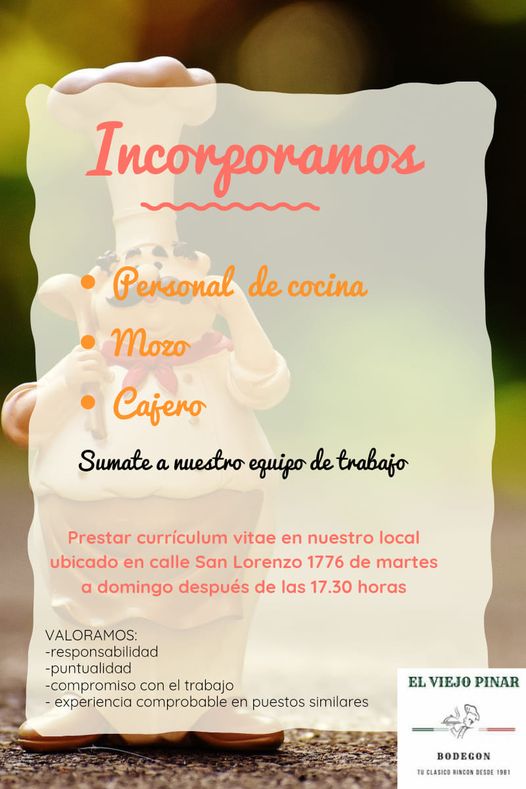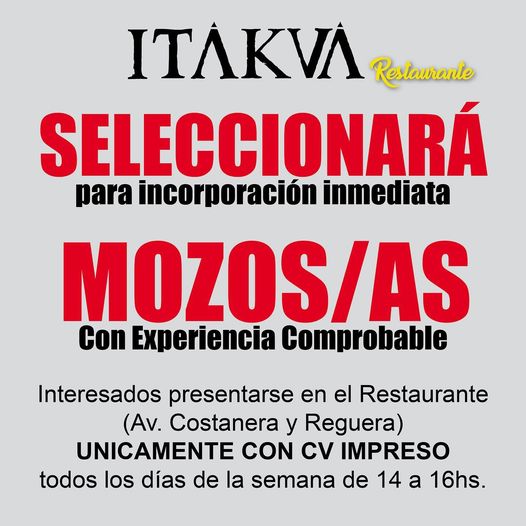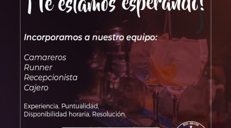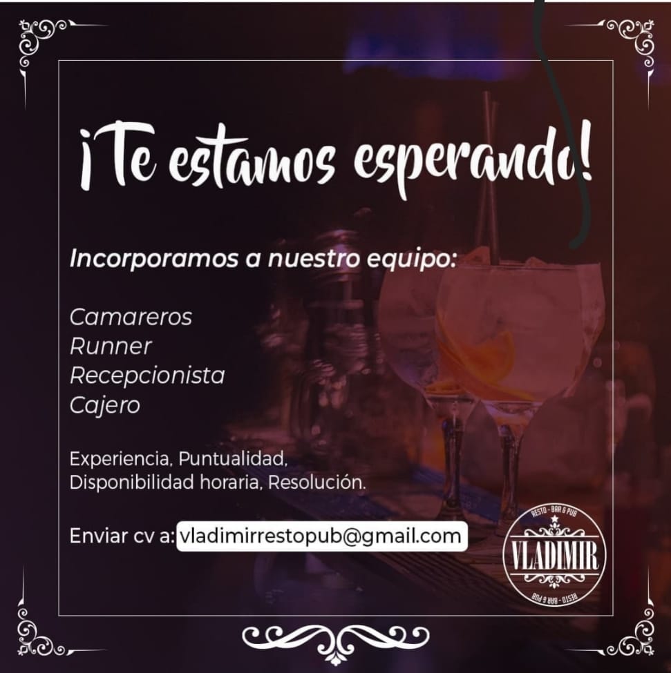 Esta semana Vladimir, en Centenario casi Corrientes, salió a pedir camareros, runner, recepcionista y cajero. También Generación Y convocó a candidatos para reforzar su plantel de mozos/as, al igual que Itakuá. El viejo Pinar, sobre la calle San Lorenzo, también publicó avisos en las redes solicitando personal de cocina, mozos y cajeros.