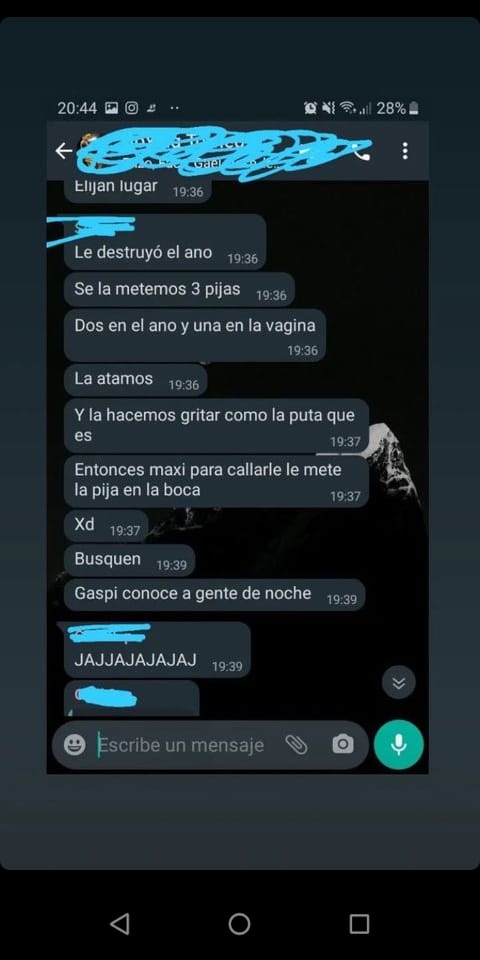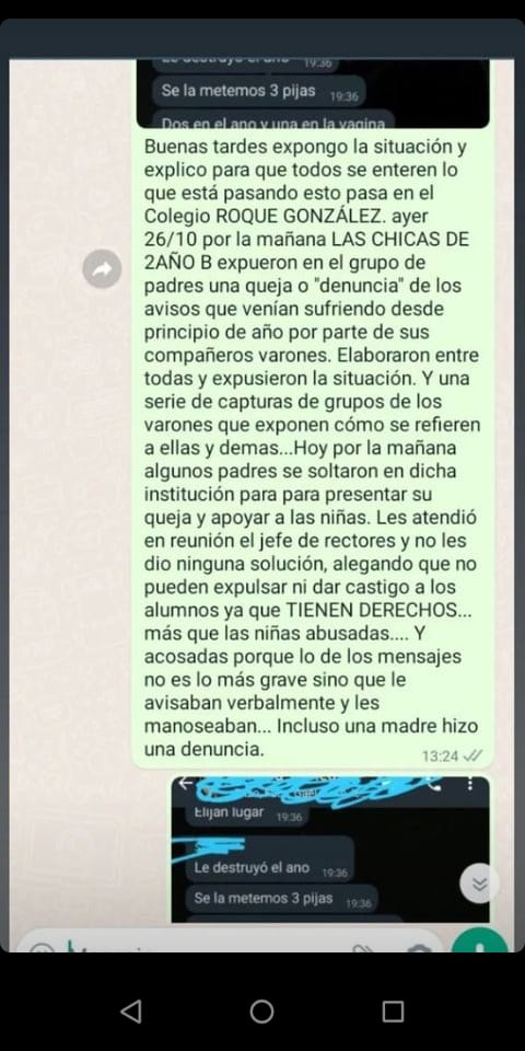Hoy se divulgaron algunos chats de esos varones de segundo año que se refirieron a sus compañeras con un contenido de violencia sexual escalofriante, mucho más por tratarse de chicos de 14 y 15 años.
