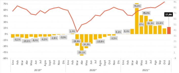– En el acumulado de los primeros once meses del año: la industria pyme sumó un alza de 22,7% frente a iguales meses de 2020 y de 2,5% frente a igual periodo de 2019.