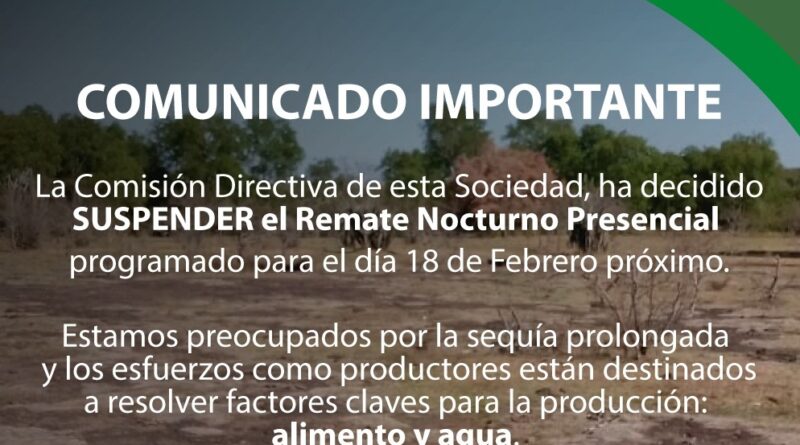 La Sociedad Rural Ovina, Equina, Caprina y Porcina de Misiones decidió suspender hasta nuevo aviso el remate nocturno de ganado menor que iba a realizarse el 18 de febrero en Fachinal.