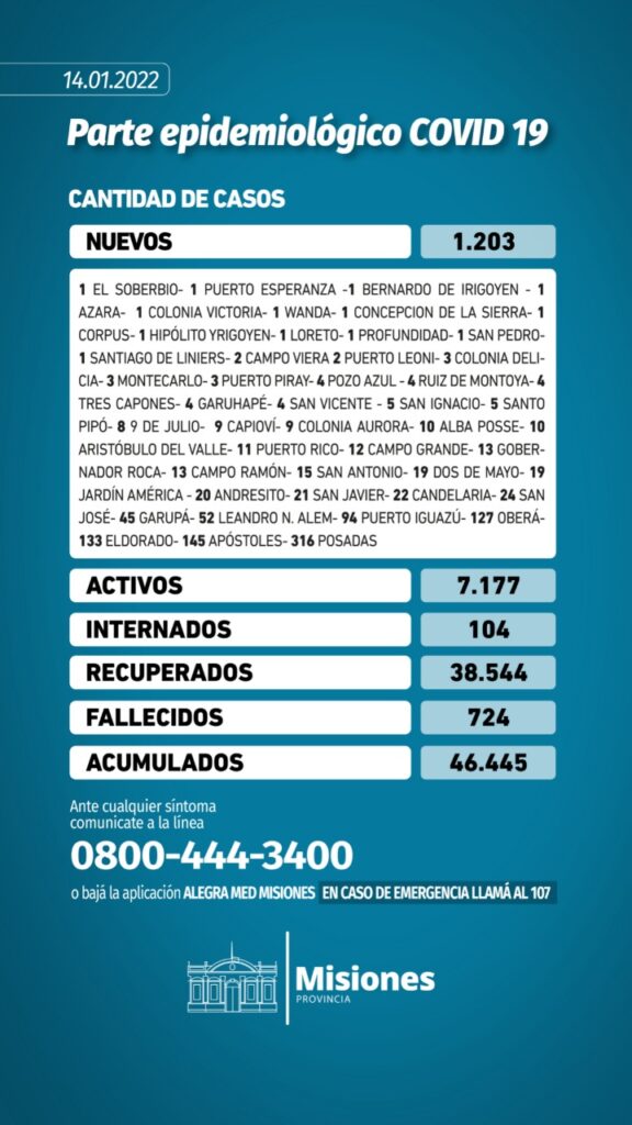En el parte del viernes 14/1 las autoridades sanitarias de Misiones informaron un nuevo récord de casos diarios que ascendió a 1.203.