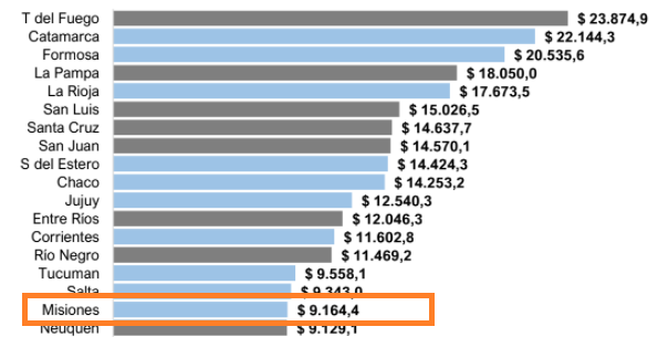 Según el relevamiento que realizó Politikón Chaco, Misiones fue la provincia que menos ingresos per cápita obtuvo, siempre y cuando no se computen los distritos ricos (CABA, Buenos Aires, Mendoza, Córdoba, Santa Fe) o petroleros (Neuquén y Chubut).