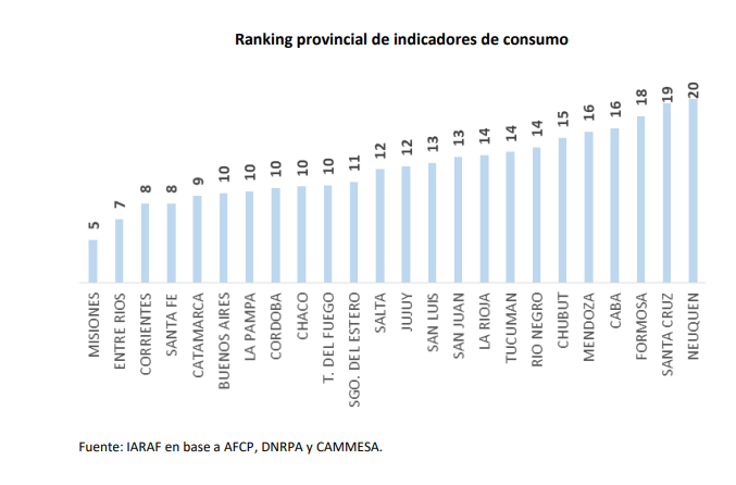 La provincia de Misiones cayó en un ranking mensual de consumo entre las provincias que elabora el Instituto Argentino de Análisis Fiscal (IARAF), un think tank de origen cordobés.
