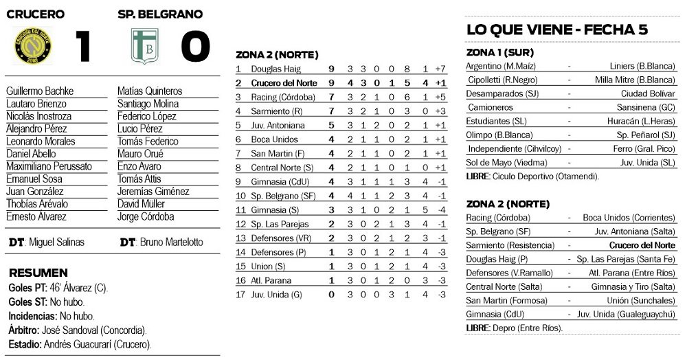 Tras la derrota ante Racing de Córdoba, Crucero del Norte volvió al triunfo ayer al derrotar por 1 a 0 a Sportivo Belgrano como local y alcanzar (al menos transitoriamente) el liderazgo de la tabla de posiciones en la zona 2, en el Federal A.