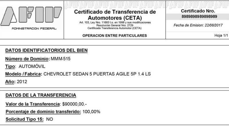 En el CETA debe consignarse el dominio, marca, modelo y fábrica del tipo de vehículo que se transfiere como así también la identificación del vendedor y el porcentaje de titularidad, así como los datos del comprador.