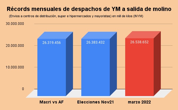 Ocasionalmente los despachos a salida de molino llegan a los 25 millones de kilos, pero solamente en 3 ocasiones en los últimos 12 años (relevados por el INYM) superaron la barrera de los 26 millones de kilos. Y fueron momentos antes de elecciones donde había incertidumbre por una suba brusca del dólar o de los precios.