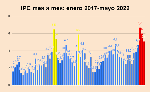 Los seis meses más fuertes en suba de precios hasta el momento en el período 2017-2022 en orden de importancia son: marzo 2022 (6,7%), abril 2022 (6%), septiembre de 2019 (5,9%) , septiembre 2018 (6,5%), octubre 2018 (5,4%).