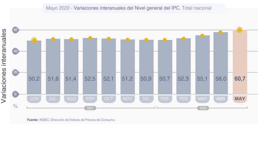 La “buena” noticia es que se trata de una leve baja respecto del 6% que marcó el IPC del mes anterior (abril) pero en el acumulado de 12 meses alcanzó el 60,1 por ciento, el mayor nivel de inflación en un año desde enero de 1992.