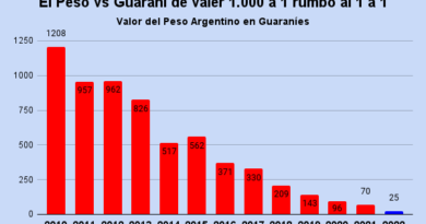 Con las últimas devaluaciones del peso en el mercado libre o “blue” la moneda argentina cotiza esta semana con una … Sigue leyendo Convertibilidad paraguaya: El Peso Argentino que valía 1.000 a 1, va rumbo al uno a uno con el Guaraní