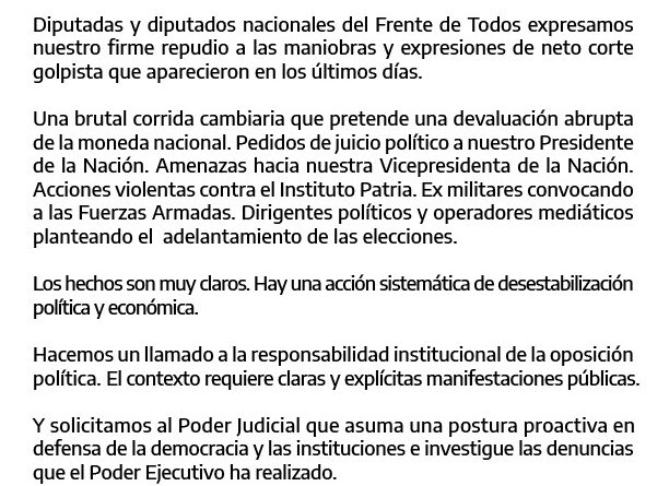 El bloque de diputados del FdT, que conduce Germán Martínez, expresó su “firme repudio” ante las “maniobras y expresiones de neto corte golpista que aparecieron en los últimos días” y llamó al Poder Judicial a “asumir una postura proactiva en defensa de la democracia y las instituciones”.