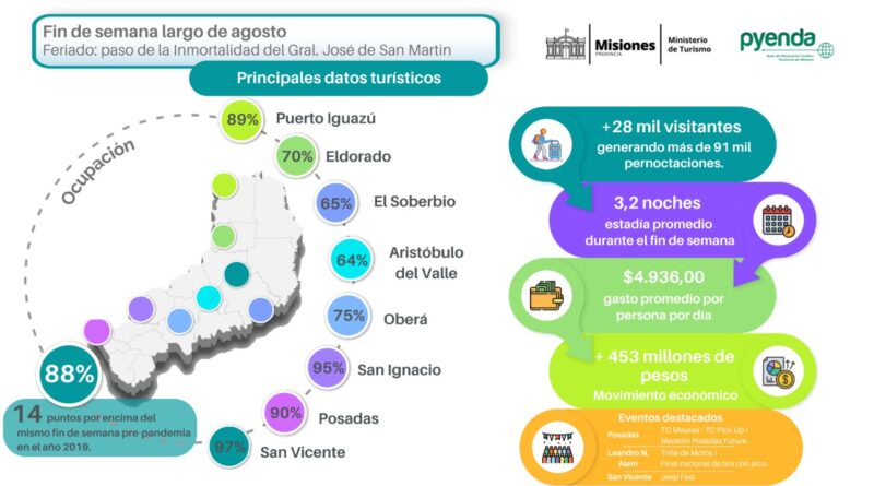 Del 88% de ocupación de alojamiento promedio, Puerto Iguazú tuvo 89%; Posadas, 90%; San Ignacio, 95%; El Soberbio, 65%; Oberá, 75%; Aristóbulo del Valle, 64%; Eldorado, 70% y San Vicente; 97%.