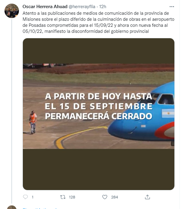 “Atento a las publicaciones de medios de comunicación de la provincia de Misiones sobre el plazo diferido de la culminación de obras en el aeropuerto de Posadas comprometidas para el 15/09/22 y ahora con nueva fecha al 05/10/22, manifiesto la disconformidad del gobierno provincial”, dijo el gobernador, en un posteo en su cuenta de twitter.