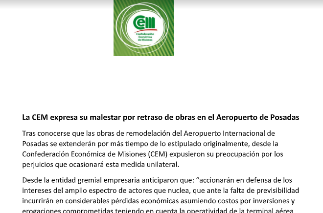 La Confederación Económica de Misiones (CEM) expresó hoy su malestar por retraso de obras en el Aeropuerto de Posadas.