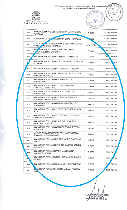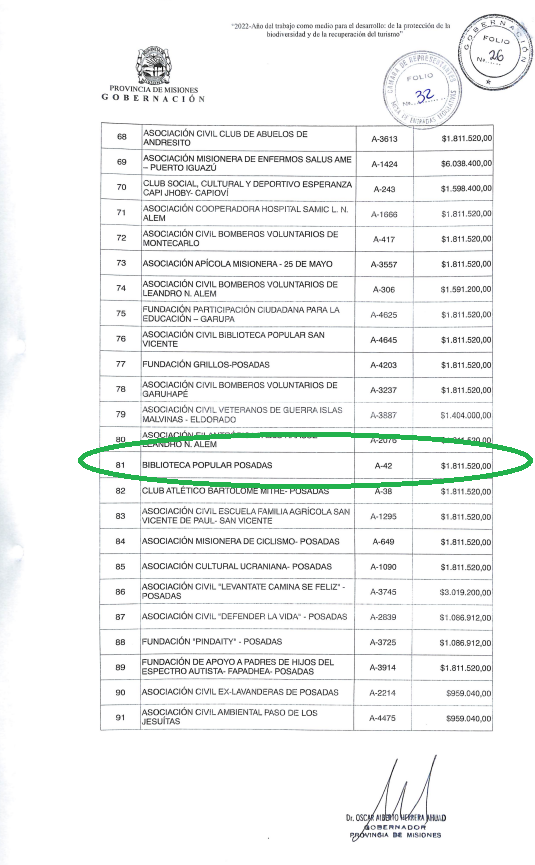 Después hay una buena cantidad de bibliotecas (26) muy chicas a las que se le asignan 600.000 pesos a cada una, a saber: BP Bartolomé Mitre (C. de la Sierra); BP Sarmiento (Santa Ana); BP Patricias Argentinas (S.Ignacio); BP D.F.Sarmiento (Oberá); BP El Palomar (Posadas); BP D.F Sarmiento (Montecarlo); BP Victorino E. Cardozo (25 de mayo); BP Horacio Quiroga (Montecarlo); BP Esc. de F. Soberanía Nacional (S. Antonio); BP Gabriela Mistral (El Soberbio); BP 23 de Septiembre (S. Rita), BP Roque González de Santa Cruz (Montecarlo); BP Nicolás Petcoff (Capioví); BP Granadero Chepoyá (Posadas); Amigos de la BP Victoria Aguirre (Iguazú); BP Dr. Bernardo Elvira (S. Javier); BP Ernesto Sábato (J. América), BP Maria Magdalena Deautier (F. de Azara), BP José Hernández (C. Grande), BP Oñondive (Puerto Piray); BP Arturo Illia (Pueblo Illia); BP del Conocimiento al Saber (Mojón Grande); BP Sur Argentino (Posadas); BP San Martín (Santa Ana); BP Horacio Quiroga (Puerto Rico); BP Alma Guaraní (Wanda).