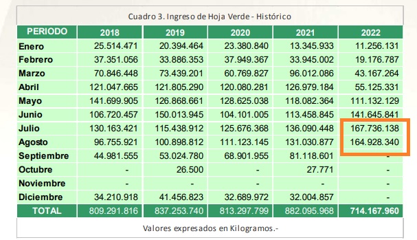 Se trata de la segunda marca más alta de la historia, detrás de los 167,7 millones de kilos de hoja verde que es cosecharon en el mes de julio.