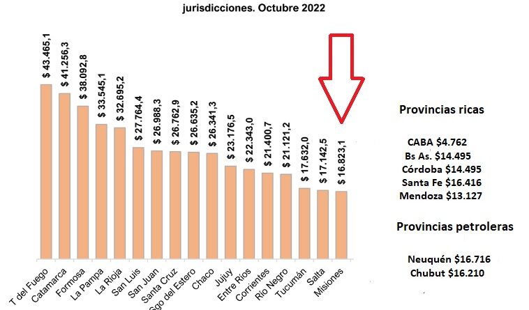 La provincia de Misiones es la que menos Coparticipación per cápita recibe del país, si se se excluyen a los distritos ricos como Buenos Aires o CABA y/o las provincias petroleras como Neuquén o Chubut.