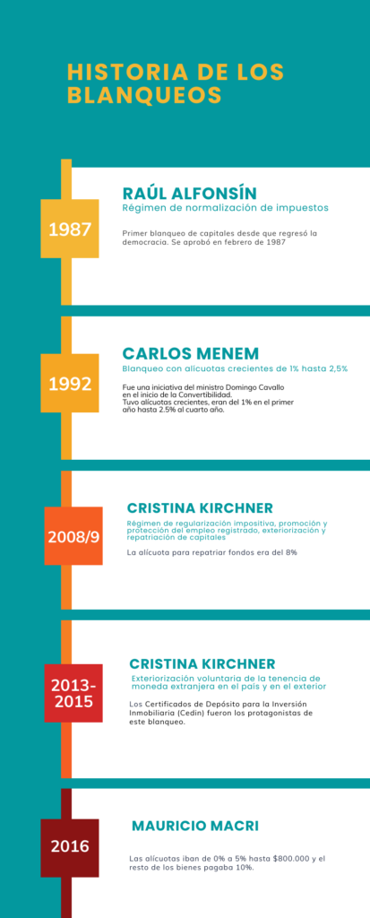 Desde la recuperación de la democracia, los gobiernos de Raúl Alfonsín, Carlos Menem, Cristina Kirchner (en dos ocasiones) y Mauricio Macri lanzaron blanqueos (ver cuadro). Este sería el sexto blanqueo general desde la restauración de 1983.