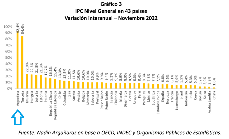 “Considerando la variación interanual de noviembre de 2022, en la muestra considerada se destacan Argentina (92,4%) y Turquía (84,4%). Luego sigue un segundo grupo de cuatro países con inflación superior al 20% interanual (Lituania, Hungría, Letonia y Estonia). En el otro extremo, Bolivia, Suiza, Arabia Saudita y China, registraron una inflación interanual inferior al 5% (gráfico 3)”, señaló el reporte, del economista Nadin Argañaraz.