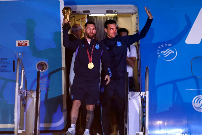 La Selección Argentina, por fin, llegó a casa tras un larguísimo vuelo de más de 20 horas (incluyendo escala en Roma) y dispuesta a empezar un gran festejo con el pueblo argentino por la obtención de la tercera Copa del Mundo.