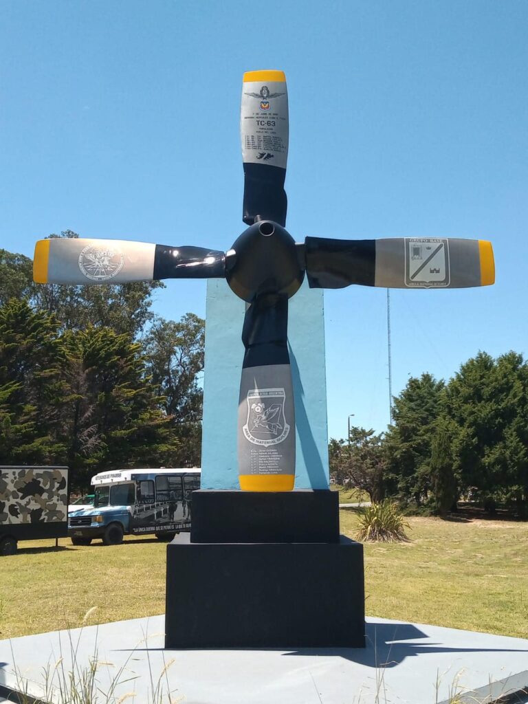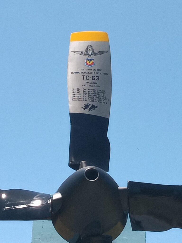 El monumento es una enorme hélice del aparato Hércules, apodado cariñosamente la “Chancha” en el ámbito aeronáutico, que lleva grabados en una punta de la pala superior los nombres de la tripulación comandada por Rubén Martel y cuyo copiloto era Krause.