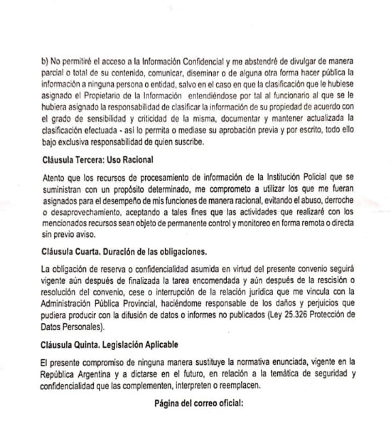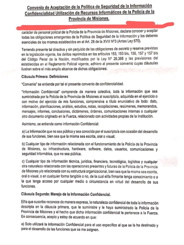 Según Primera Edición, el documento tiene cinco clásulas y se titula “Convenio de aceptación de la política de seguridad de la información, confidencialidad, utilización de recursos informáticos de la Policía de la Provincia de Misiones”.