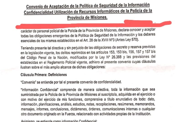 Según Primera Edición, el documento tiene cinco clásulas y se titula “Convenio de aceptación de la política de seguridad de la información, confidencialidad, utilización de recursos informáticos de la Policía de la Provincia de Misiones”.