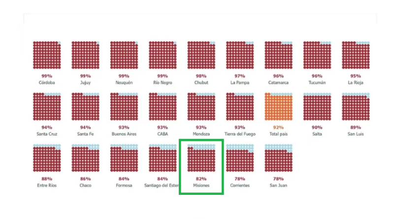 Pero nuevamente, los resultados varían por provincia. En CABA el porcentaje llega a 63% (satisfactorio), mientras que en Misiones es el 31%, siendo la cuarta peor provincia solamente superando a Chaco (25%), Catamarca (26%) y Corrientes (30%).