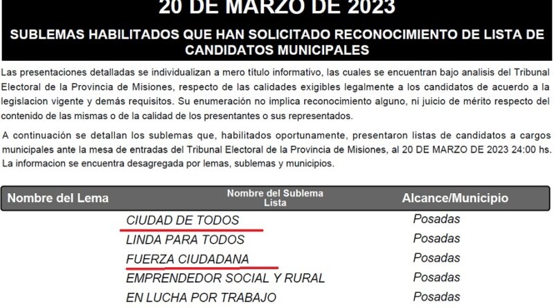 La Justicia Electoral de Misiones dio a conocer esta semana la lista de sublemas habilitados para las elecciones de intendente y concejales del próximo 7 de mayo en los 78 municipios de la provincia.