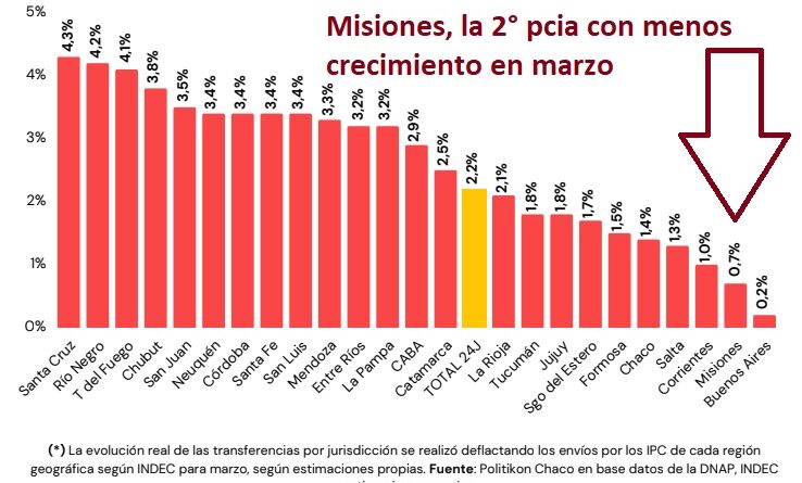Según la consultora Politikón, en el mes de marzo Misiones fue la segunda provincia con menor incremento de la Coparticipación en términos reales (o eliminando los efectos de la inflación en el cálculo), con apenas el 0,7% de aumento. Solo superando a Buenos Aires (0,2%).